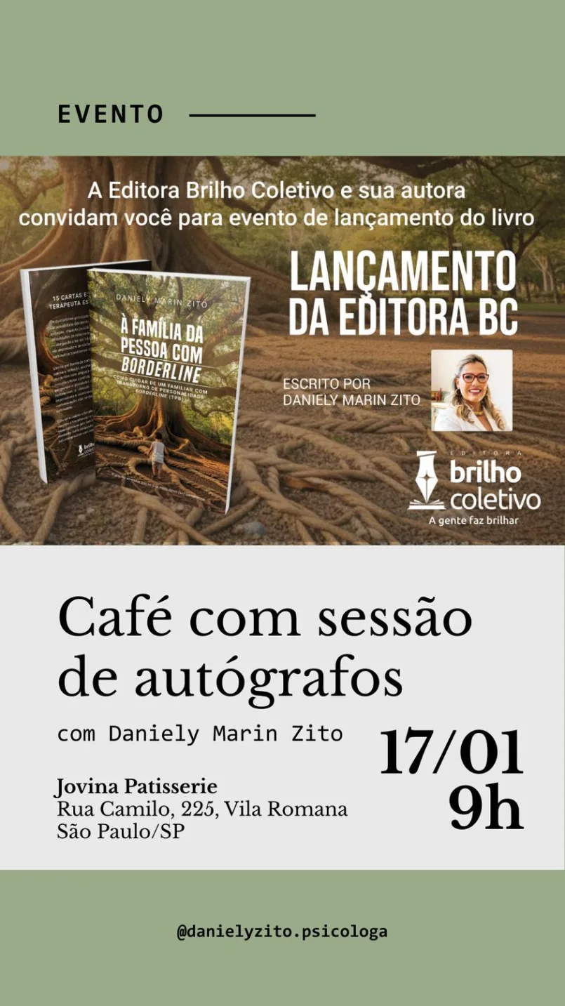 Café com sessão de autógrafos do livro “A família da pessoa com Borderline”, escrito por Daniely Marin Zito.